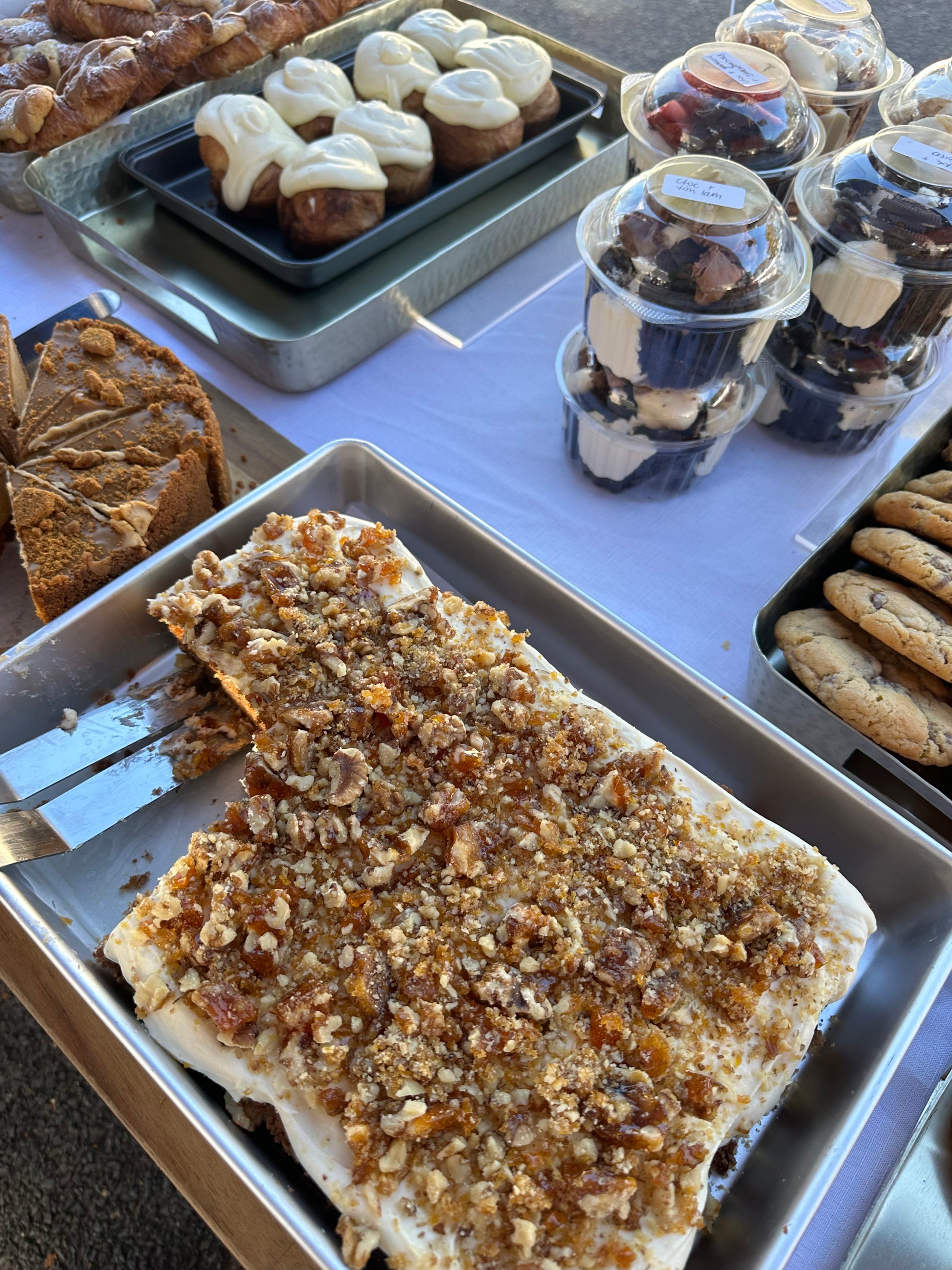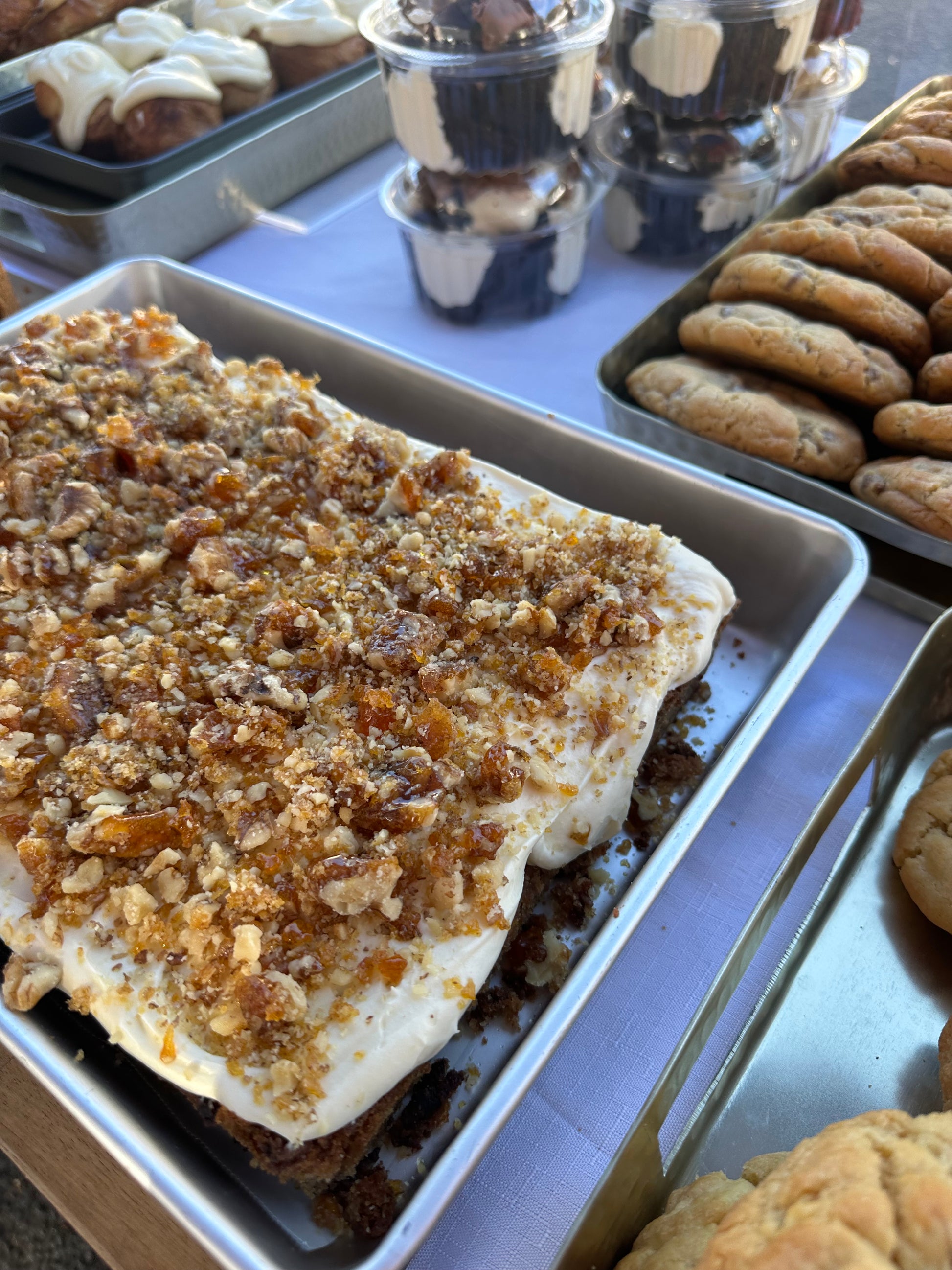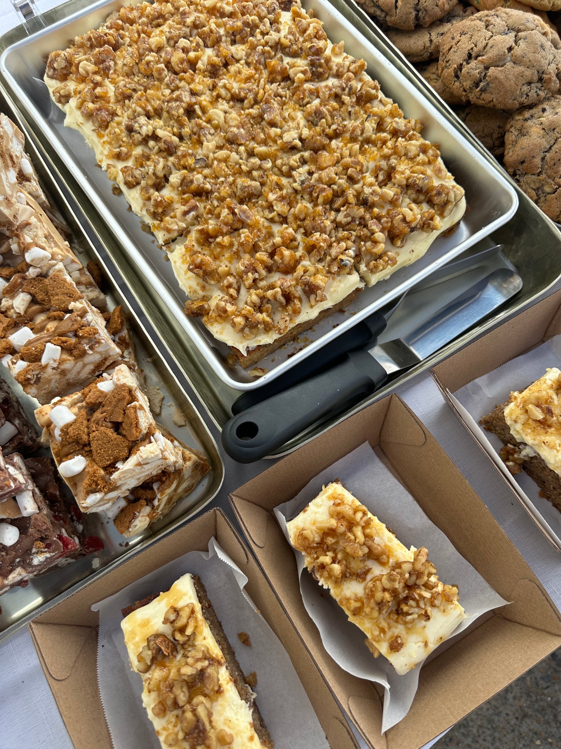 Indulge in our famous carrot cake, featuring a moist texture and a thick layer of rich cream cheese frosting. Topped with candied walnuts for added crunch and flavour, this dessert is a true delight for your taste buds. Satisfy your sweet tooth with every bite.