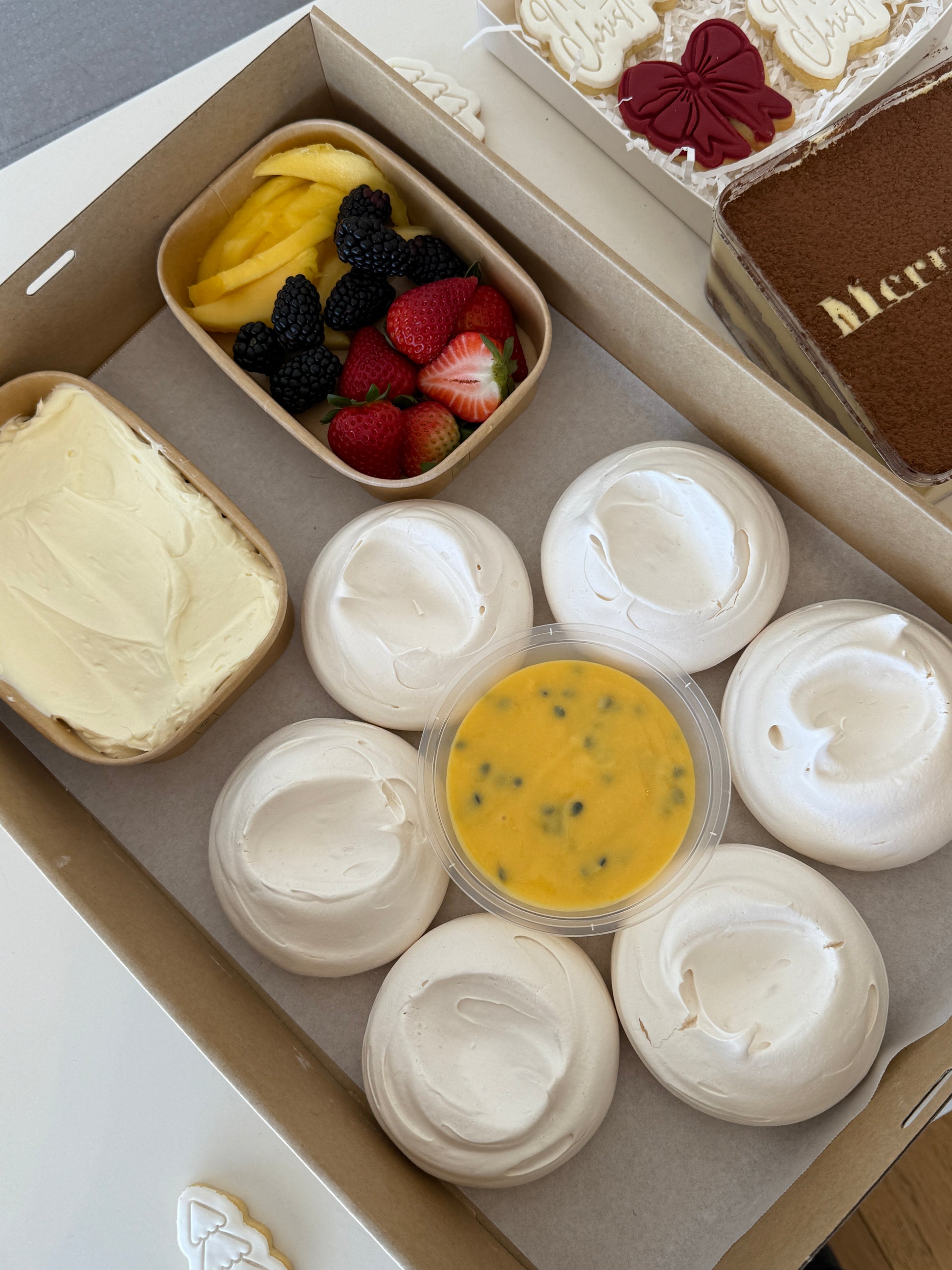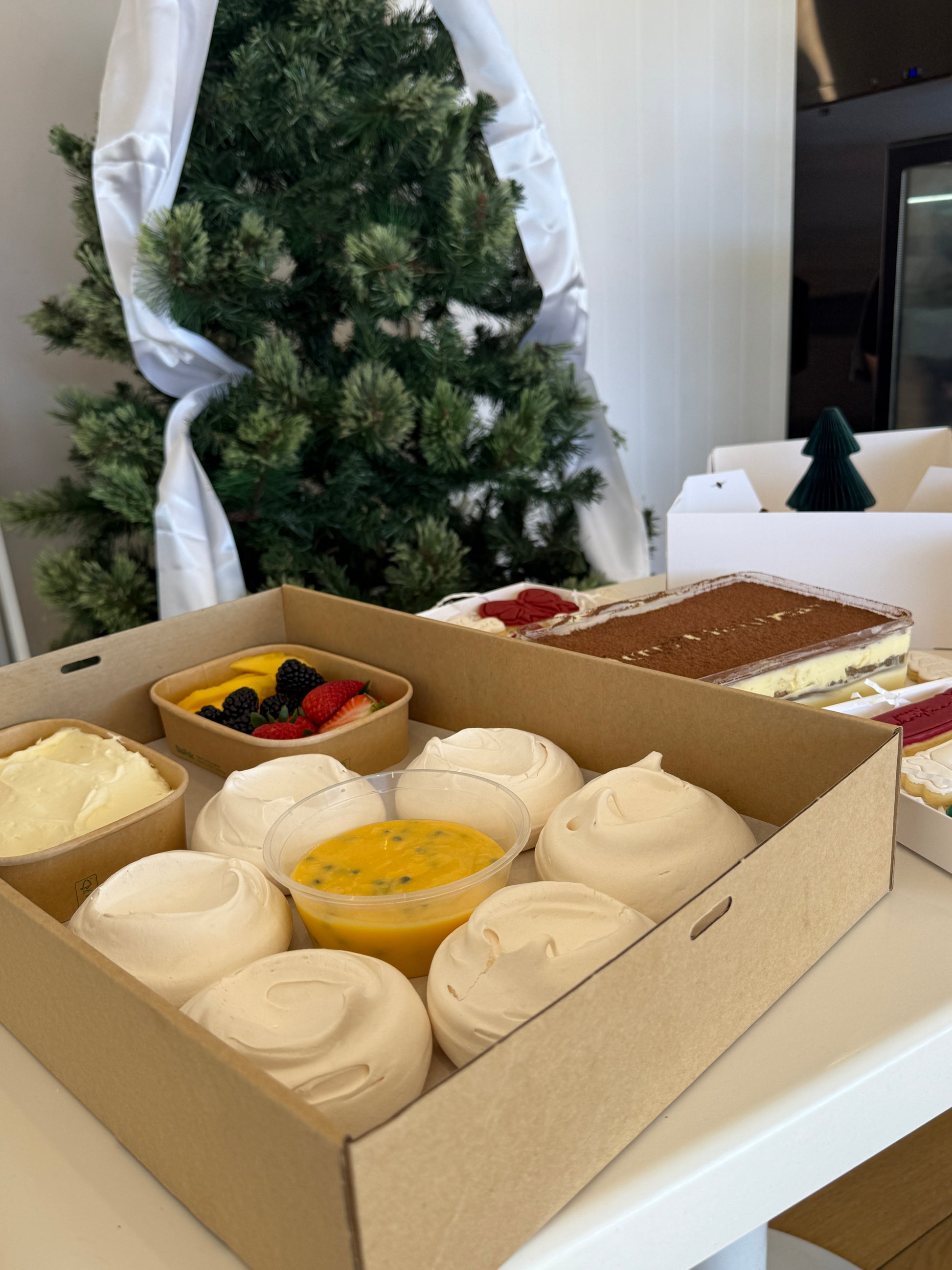 Create your own festive masterpiece this Christmas with our DIY Pavlova kit! We've done the hard work you get to have all the fun. Each kit comes packed with six delicate small pavlovas, luscious cream, tangy passionfruit curd and fresh berries and mango.