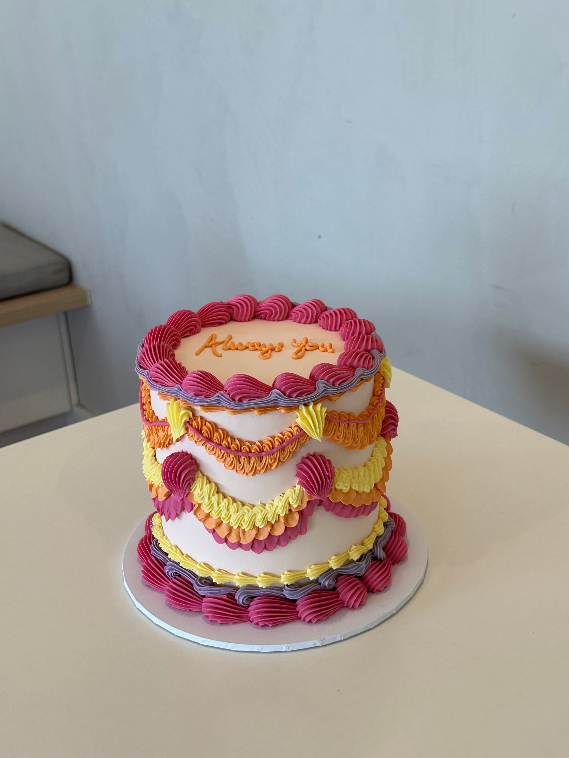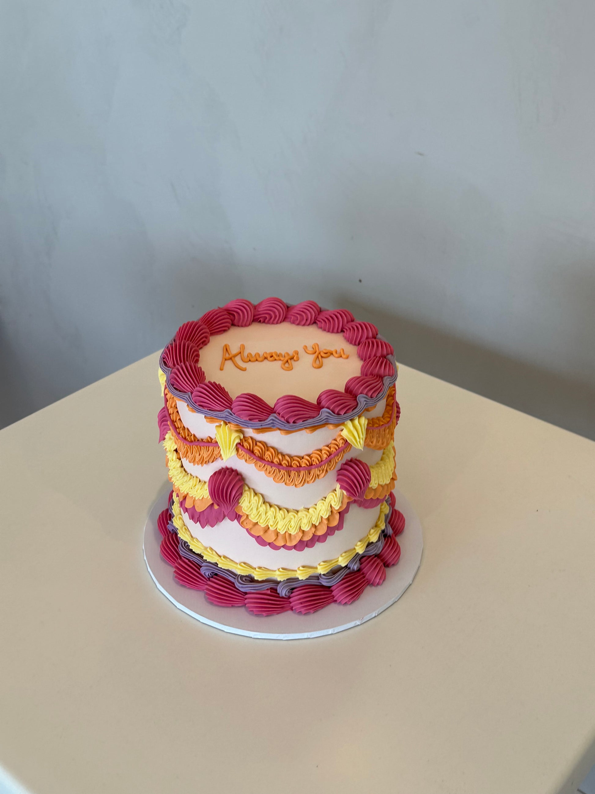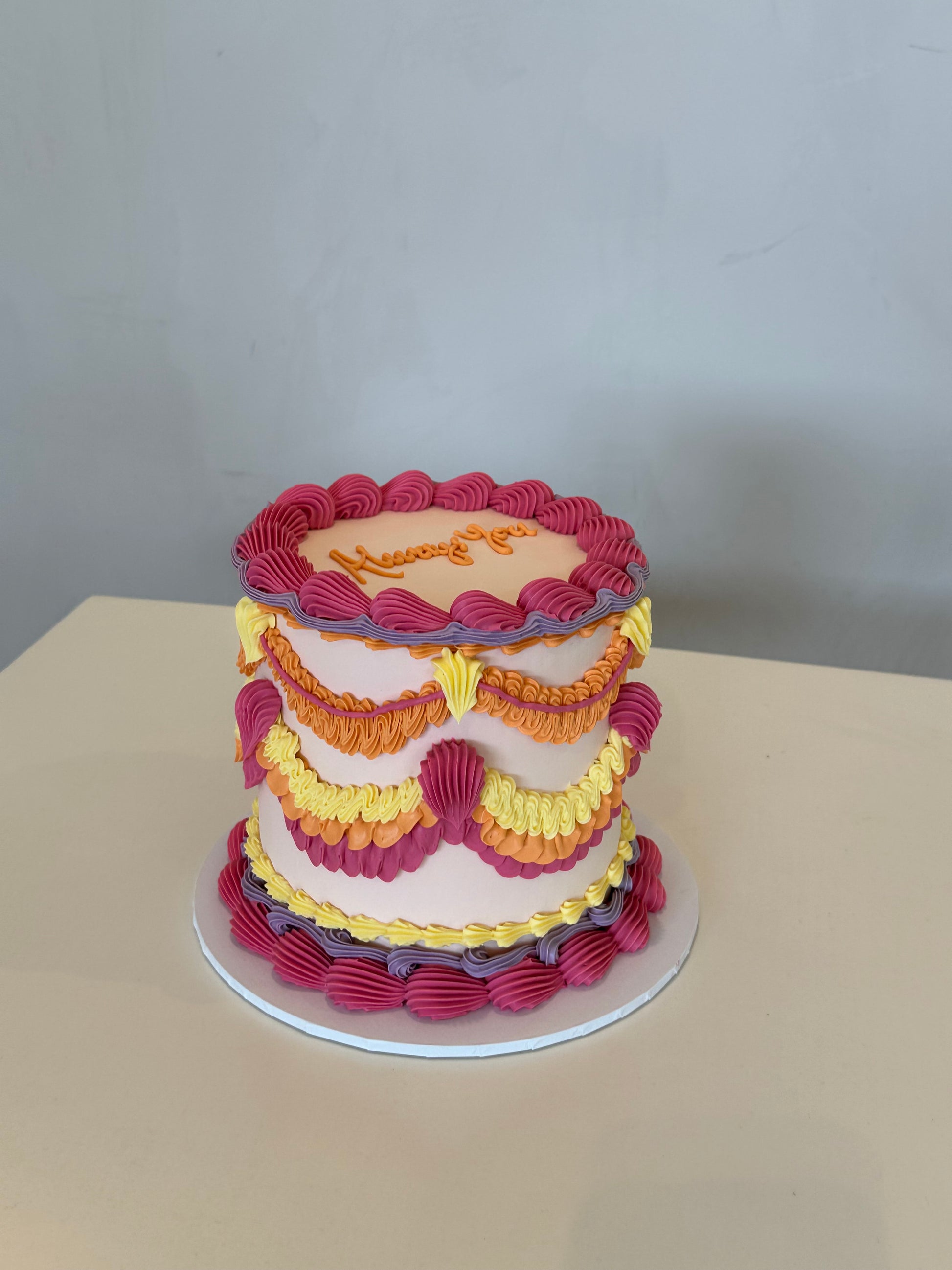 Please note: the 2 layer cakes may not have as much piping due to being shorter and having less space.