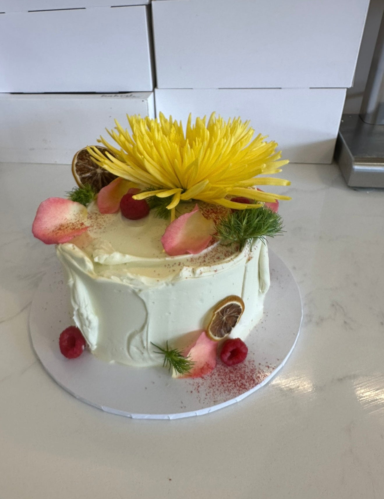 A messy buttercream base, with seasonal florals, petals and seasonal fruits