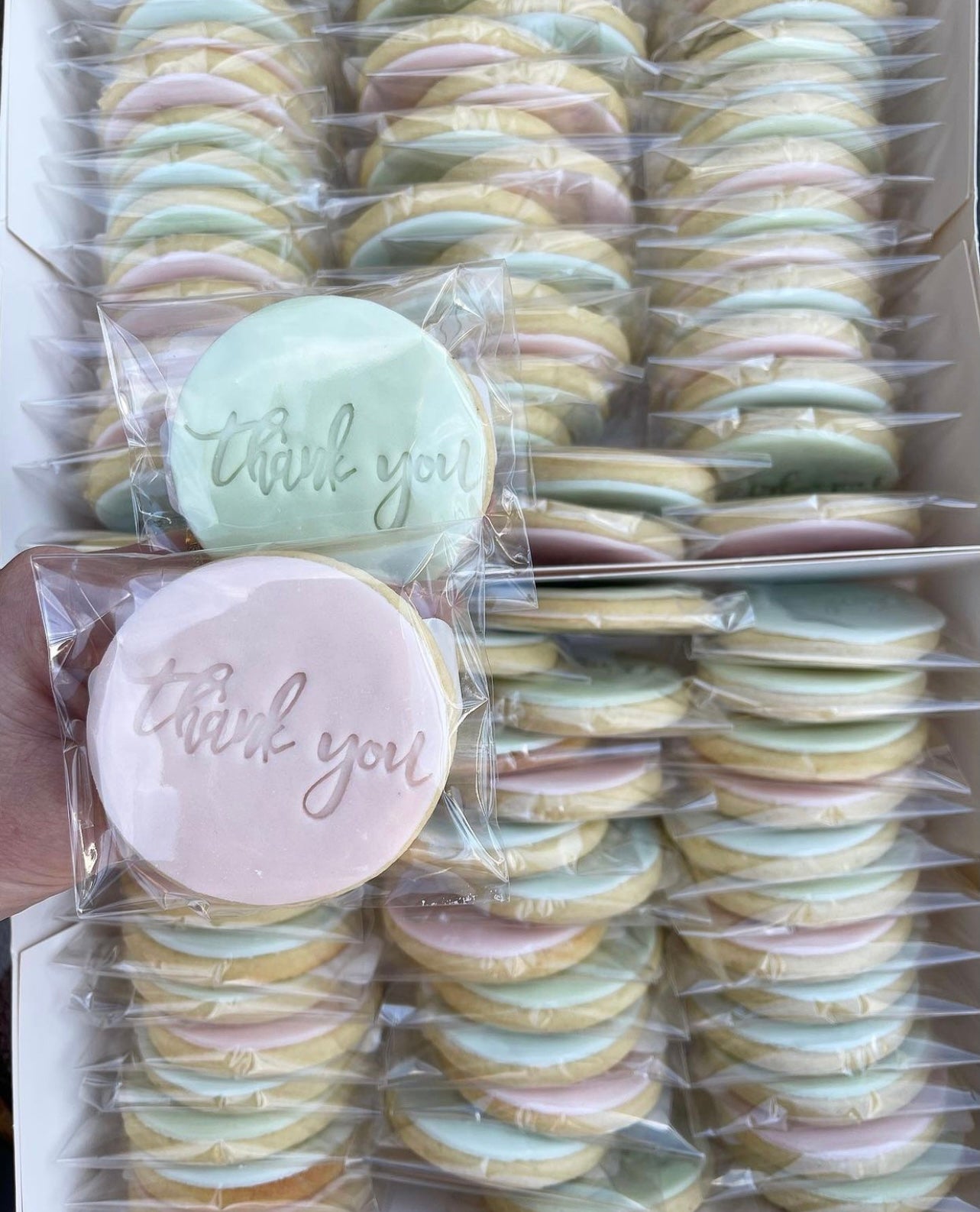 All of our cookies are homemade and flavoured with vanilla bean and topped with our own homemade marshmallow fondant. Cookies come individually wrapped and can last up to 6-8 weeks!