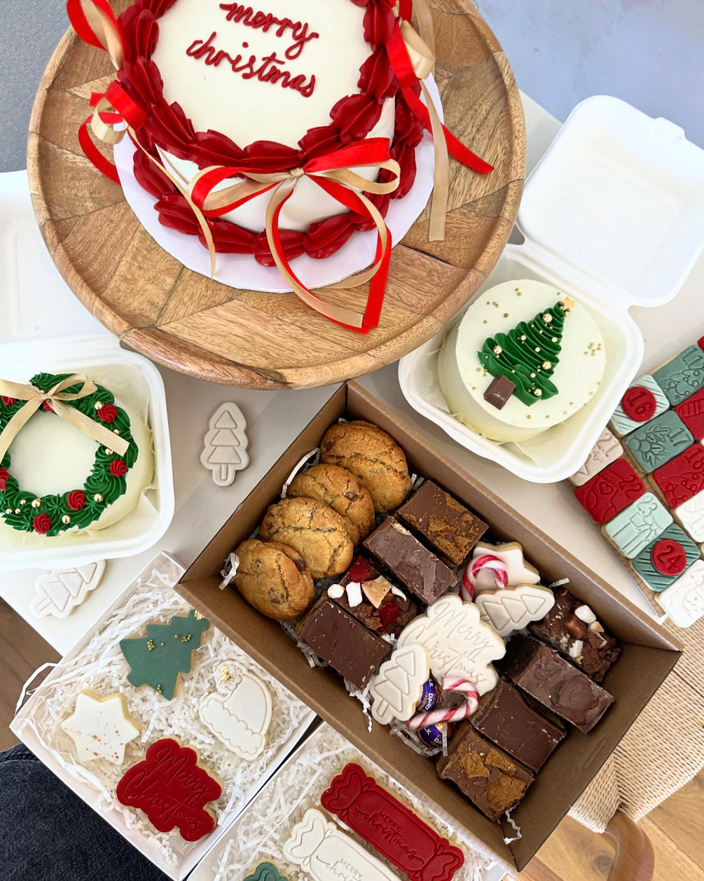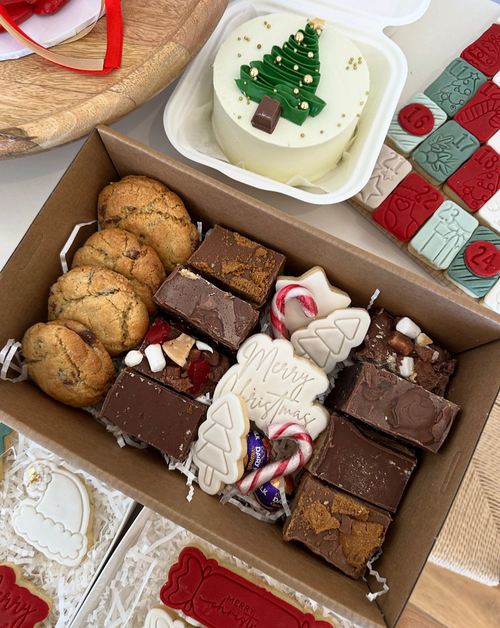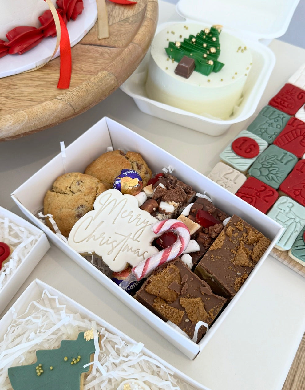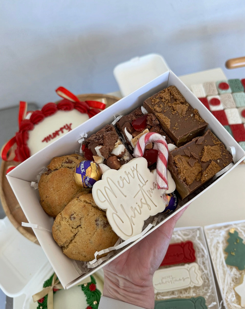 small: 2 mini nyc cookies, 2 Biscoff slices, 2 Tim tam rocky roads, merry Christmas sugar cookie, chocolates