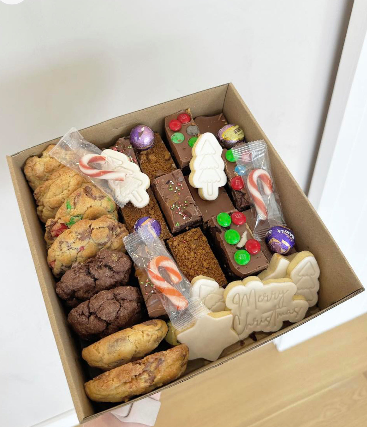 large: 8 mini nyc cookies, 4 Biscoff slices, 2 Tim tam rocky roads, 2 caramel slices, 4 brownies, sugar cookies, chocolates