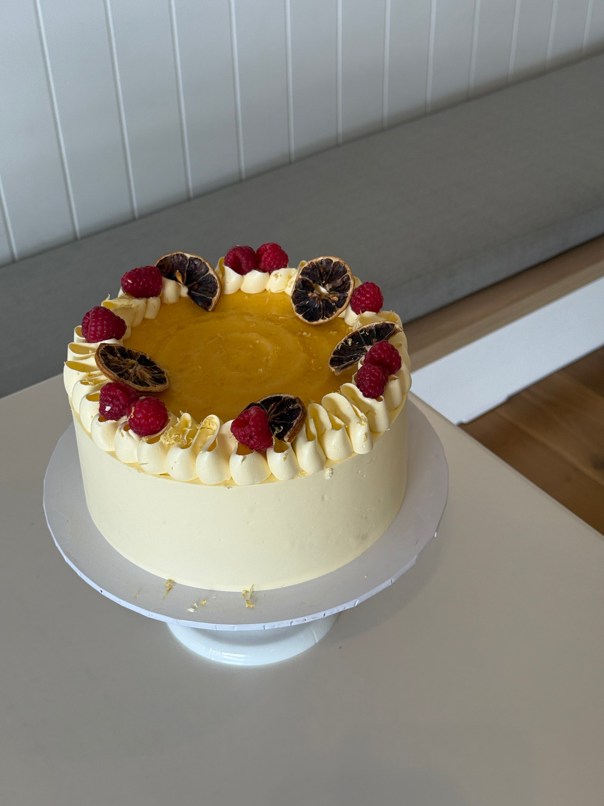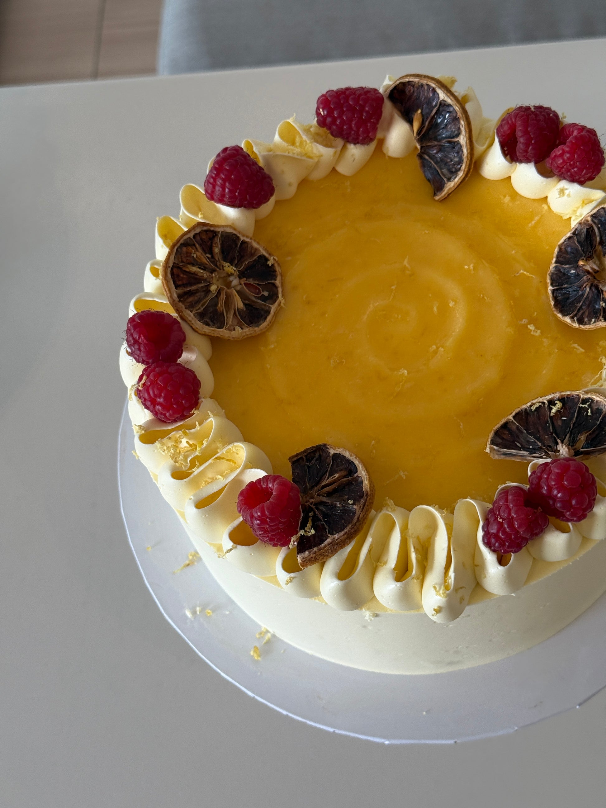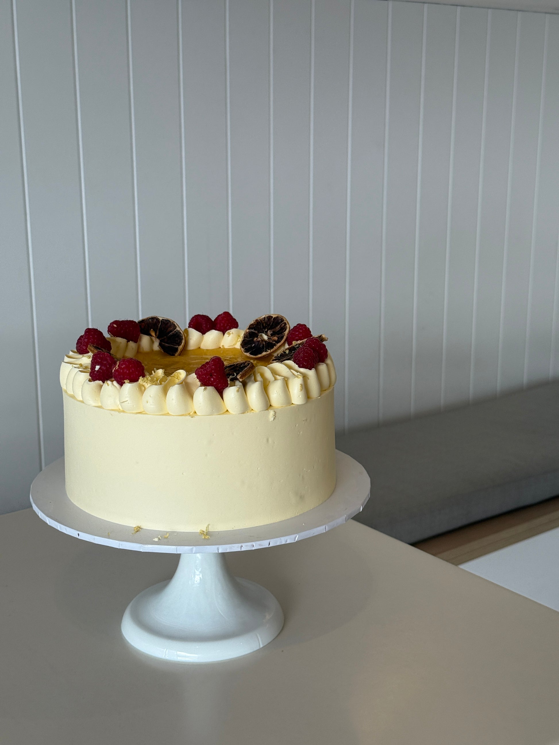 Indulge in a perfect balance of sweet and tart flavours with our Vanilla Lemon Curd Cake. Made with layers of rich vanilla cake and topped with tangy lemon curd, each bite is a burst of decadence. Served with seasonal berries, this cake is sure to delight your taste buds. Available in two sizes, large size pictured.